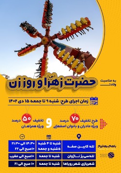 مدیرعامل شرکت توسعه مجتمع‌های سیاحتی، فرهنگی و ورزشی سپاهان شهرداری اصفهان گفت: به مناسبت طرح تخفیفی روز مادر و مصوبه شورای محترم اسلامی شهر ساعت فعالیت ابرسازه‌های تفریحی اصفهان در این هفته اعلام می‌گردد.