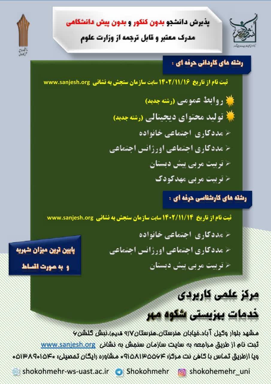 شایان ذکر است دانشجویان و علاقمندان به تحصیل در این دانشگاه برای تحصیل در مقطع کاردانی تا پایان وقت اداری ۱۸ بمهمن و در مقطع کارشناسی تا پایان وقت اداری ۲۰ بهمن ماه می توانند به نشانی بلوار وکیل آباد، خیابان هنرستان 7، نبش گلشن 6 و شماره تماس 38645548مراجعه نمایند.‌