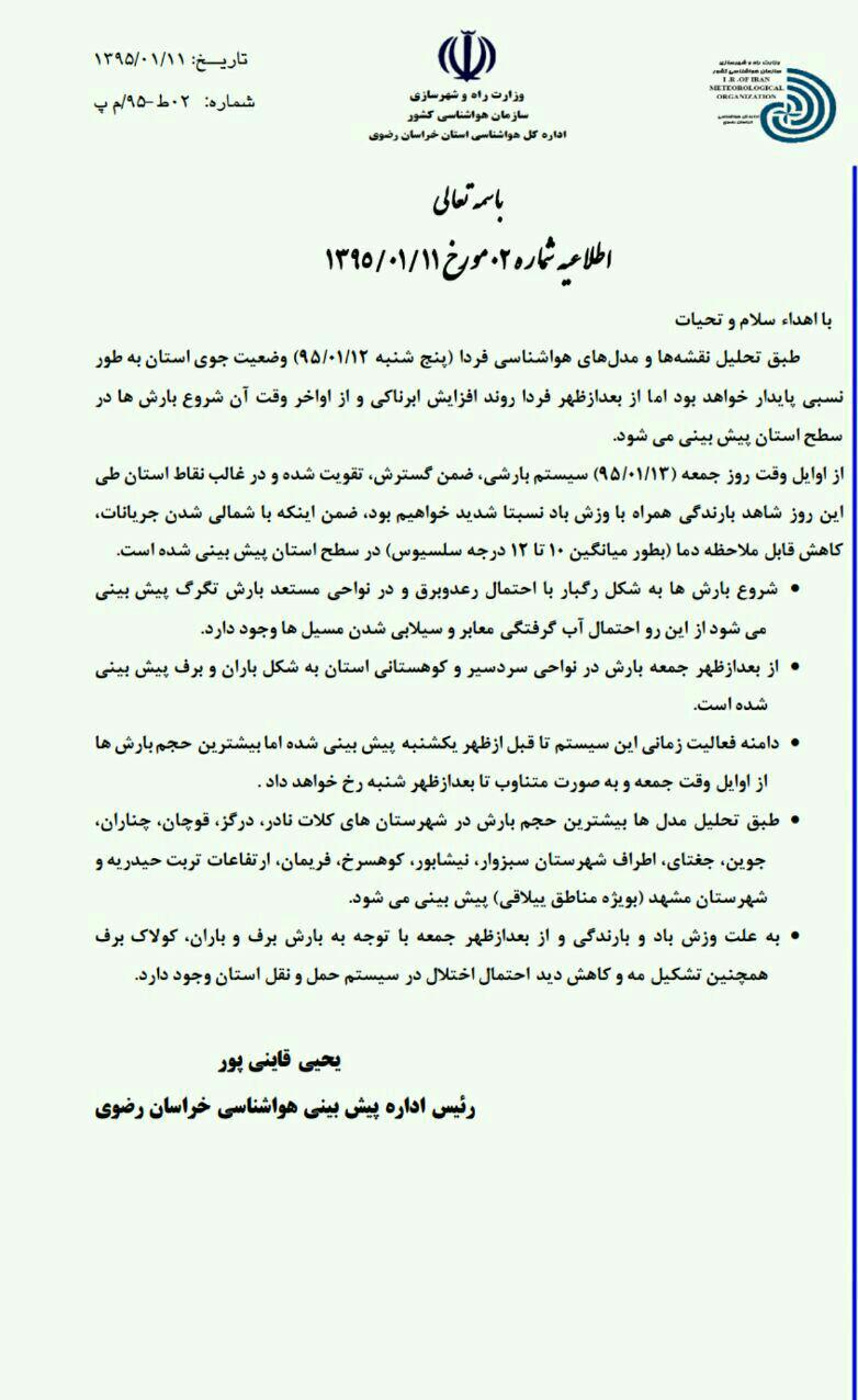 در اطلاعیه پیش بینی هواشناسی خراسان رضوی آمده است: طبق تحلیل نقشهها و مدلهاي هواشناسی فردا (پنج شنبه 12/01/95) وضعیت جوی استان به طور نسبی پایدار خواهد بود اما از بعدازظهر فردا روند افزایش ابرناکی و از اواخر وقت آن شروع بارش ها در سطح استان پیش بینی می شود.