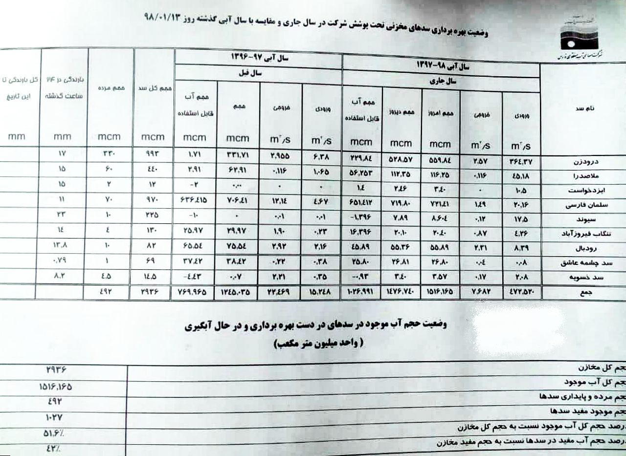جدول زیر میزان ورودی آب به سدهای استان فارس و همچنین حجم آب موجود در این سدها را نشان می دهد.همچنین این پارامترها را با مدت مشابه سال قبل مقایسه می کند.