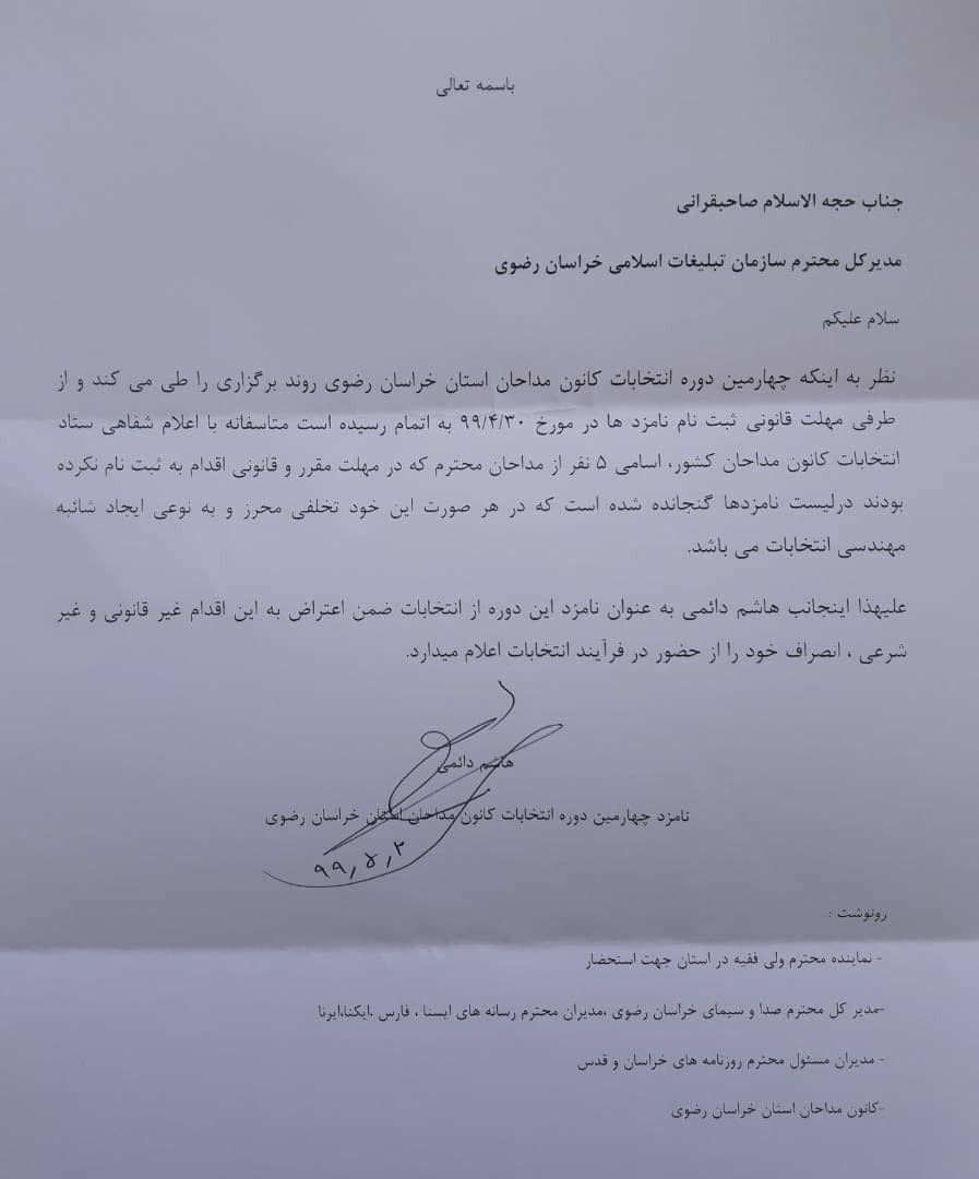 به گزارش تابناک رضوی، هاشم دائمی در نامه ای به حجت الاسلام صاحبقرانی که نسخه ای از آن در اختیار تابناک قرار گرفت، آورده است: با توجه به پایان مهلت قانونی ثبت نام نامزدها  در مورخه 30 تیرماه 99 متاسفانه با اعلام شفاهی ستاد انتخابات کانون مداحان کشور اسامی 5 نفر از مداحان محترم در لیست نامزدها گنحانده شده که تخلفی محرز و به نوعی ایجاد شائبه مهندسی انتخابات دارد.